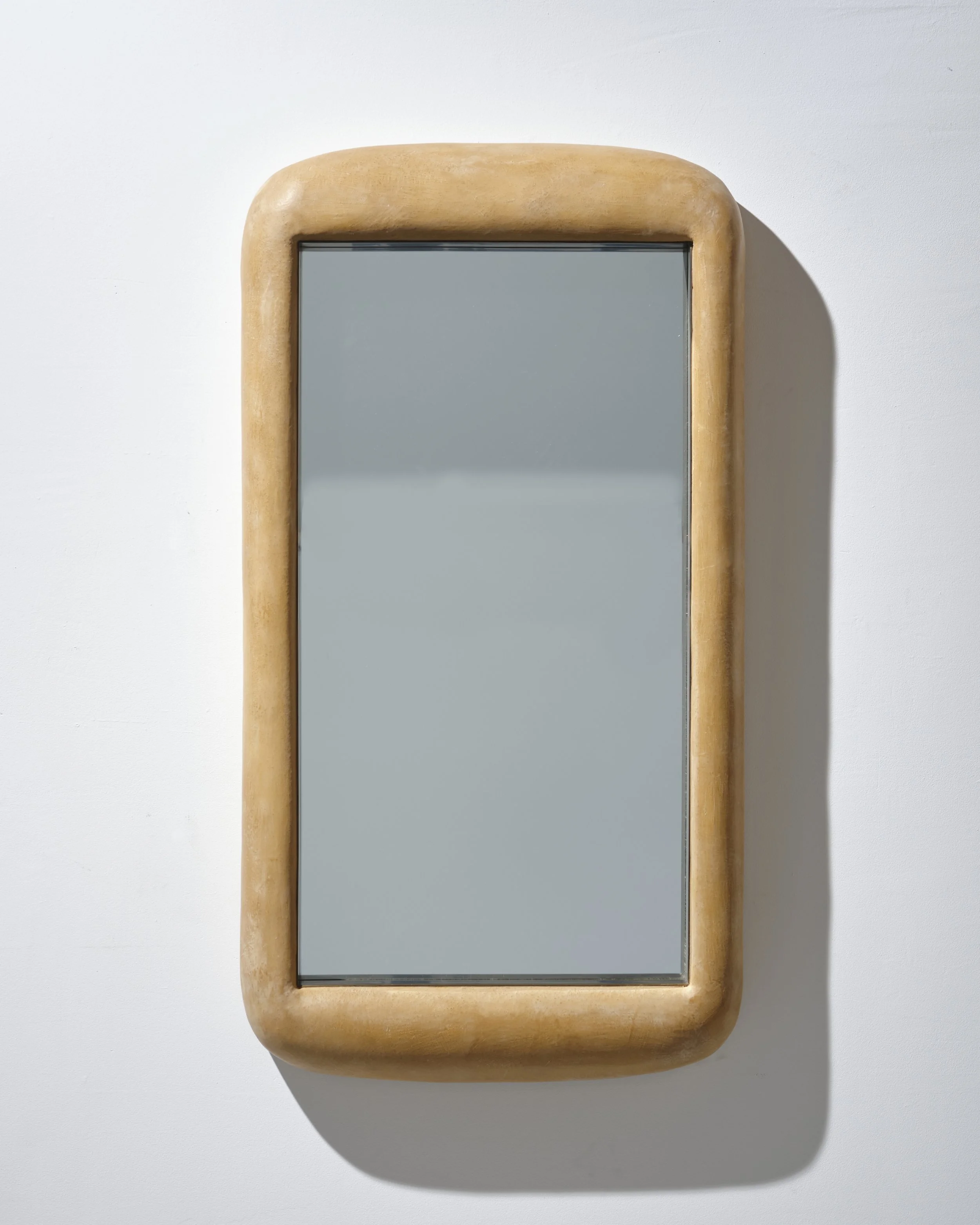 Frame: Hand-sculpted and integrally pigmented concrete, antiqued brass, and wood.