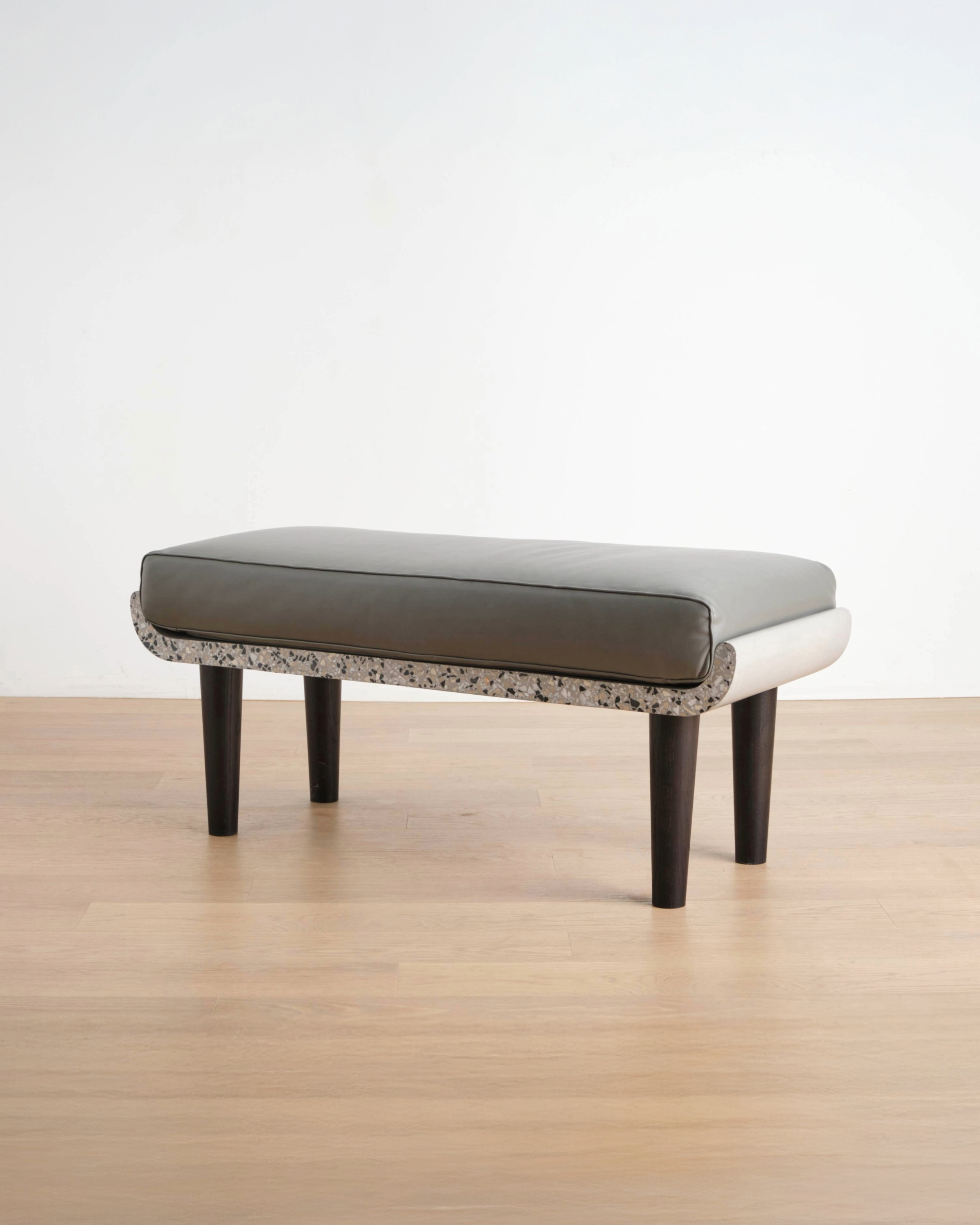 Drawing inspiration from the elegant Asante wooden Sesedwa stools of Ghana in West Africa, the U Sit Bench captures the essence of this tradition. Its design showcases a curved cast terrazzo concreteseat, cradling a plush and substantial leather cushion. The polished sides of the seat reveal an intricate mosaic of embedded stones, adding a touch of natural allure to the piece. This harmonious fusion of materials and textures creates a captivating visual contrast. Resting gracefully atop blackened turned Ash wood legs, the U Sit Bench is a fusion of tradition and modernity, resulting in a harmonious blend of form and function.
